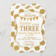 Bold white and gold glitter-look dot print with birthday banner sign over a gold three lettering modern birthday invitation card design.