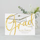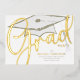 This design features a graduation grad gold calligraphy script, an elegant graduate graduation cap, a modern mortarboard tassel hat, a graduation grad party invitation, an elegant typography style design, s simple minimalist minimal whimsical, with s vellum photo overlay back side, for high school or college senior, with a gold tan brown beige black, s simple graduation party invitation