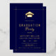 Goldgraduation cap Class Of 2026 navy blue formal graduation gold foil invitation. Honor the achievements of the Class of 2026 graduate with these elegantly crafted real gold foil navy blue invitations. Adorned with a gold graduation cap and delicate gold borders that meet at the corners, these invitations look elegant and classy.