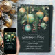 Elegant Christmas holiday party invitations feature pine branches, green and gold Christmas ball ornaments and ribbons on a dark green background with your details in chic lettering, perfect for your festive holiday gathering. MATCHING items in our collection.