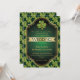 Gold, green Irish clover and frame wedding personalised invitation featuring a green clover with gold outline, a gradient green frame with gold outline, a gold banner and a pattern with shamrocks. This modern, elegant and stylish template design is totally customisable and is perfect for Saint Patrick's or St. Patrick's Day Irish weddings.