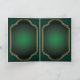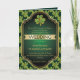 Gold, green Irish clover and frame wedding personalised invitation featuring a green clover with gold outline, a gradient green frame with gold outline, a gold banner and a pattern with shamrocks. This modern, elegant and stylish template design is totally customisable and is perfect for Saint Patrick's or St. Patrick's Day Irish weddings.