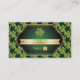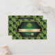Gold, green Irish clover and frame wedding place card featuring a green clover with gold outline, a gradient green frame with gold outline, a gold banner and a pattern with shamrocks. This modern, elegant and stylish template design is totally customisable and is perfect for Saint Patrick's or St. Patrick's Day Irish weddings.