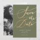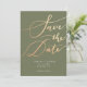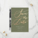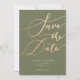 Elegant and simple wedding save the date card. The hand lettered typography text is in faux gold glitter against an olive green background.