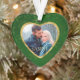 This is a beautiful Christmas ornament that features your photograph within a shiny gold heart shaped frame. The frame is placed on a background of pretty gold leaves and vines on a Holiday green background. The back of the ornament has the same heart frame with your custom text in gold on a matching green background. A wonderful keepsake gift for newlyweds, anniversaries, or any couple.