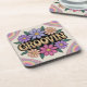 This coaster features a retro-style psychedelic poster design cute fun metallic gold GROOVIN text centre with pretty flowers above and below it. Pretty pastel psychedelic light colours are in the corners of the picture like swirling rainbow gradients creating a trippy, 1960s aesthetic. The rainbow patterns consist of concentric circles in orange, yellow, green, blue and purple colours. The background is a beige colour. The coaster is a hard plastic coaster with a cork backing. There are six plastic coasters in the coaster set.