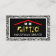 Design features a black rectangular cover encapsulated by a white frame set against a stone pebbled layer. Underneath the red rooftop with windows is an array of gold handyman tools. The business name (which you can change) is near the base of the card.