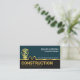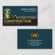 A cyan blue layer and a dark grey piece is demarcated by faux gold bulb tree motif with an underlying hammer, faucet, leaf and chimney rooftop symbol. These symbols show the expertise that you have in construction works i.e. building, renovation works, plumbing, landscaping, roofing etc.
