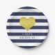 Set of birthday party paper plates with a faux gold foil heart on a blue and white striped pattern. Matching party decor available.