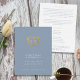 Decorative old gold styled heart monogram wedding directions and schedule guest information card in blue grey, gold and white. A simple elegant wedding card ideal to help your guest understand how to reach your wedding destination and see the schedule, and their point of contact if anything doesn't go to plan on your wedding day. Personalise with your own details. Other matching items are also available. If you need help please contact me. © Original art and design by Sarah Trett exclusively for www.mylittleedenweddings.com