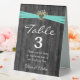 Aqua ribbon in heart with baby's breath bouquet on rustic dark grey barn wood for table number tent.
