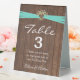 Aqua ribbon in heart with baby's breath bouquet on rustic brown barn wood for table number tent.