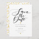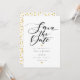 This minimalist save the date card features two gold hearts and an elegant script save the date above your details set in elegant typography. The reverse features gold hearts confetti. Designed by Thisisnotme©