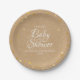 Gold hearts are scattered around your personalised details set in elegant text on a rustic kraft boho background on this chic gender neutral baby shower, sprinkle or couples shower paper plate.