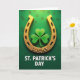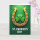 This design shows a golden horseshoe centered on a deep green background, with an emerald shamrock nestled inside it like a close companion 💚. The horseshoe has a metallic shine and neat nail holes, and the shamrock’s three leaves look softly textured, as if you could feel their ridges. Behind them, faint shamrock shapes repeat across the backdrop, adding depth without pulling focus from the main pair ☘️. Along the lower curve of the horseshoe, the word “LUCKY” appears in matching gold, tucked in as a small detail you notice on a second look. Below the illustration, “ST. PATRICK’S DAY” sits in bright white, centered near the bottom edge in large, easy-to-read letters. Gentle shadows fall to one side, giving the horseshoe and shamrock a lifted, almost three-dimensional look that feels cozy and inviting. The background remains a rich, dark green with soft, shadowy shamrock motifs scattered throughout.