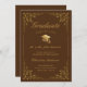 Announce your daughter's graduation from high school or college to family and friends with this elegant traditional formal announcement card. This chic design features faux gold grad cap and script on a brown background framed with a border of faux gold ivy filigree botanical leaves. The classic calligraphy styled text reads "Graduate Class of 20XX" with parents' names, graduate's name, school, honours and year to personalise Designed by Susan Coffey.