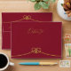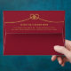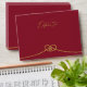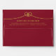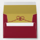 A modern and minimalist burgundy red and yellow gold circle double happiness knot of union, love and marriage on a wedding envelope with personalised return name and address.