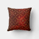 This throw pillow features a pattern of gold leaves and berry sprigs on a rich burgundy red gradient background that almost seems to glow. Both sides of the pillow have the same pattern.
