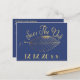 Elegant gold leaf graphic art save the date postcard. Send a message to your family and friends to save the date for your wedding, anniversary, birthday, retirement or other party. Design features a blue background with gold text.