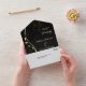 This pretty all season wedding invitation with tear away RSVP card in tones of gold and black will give a sense of elegance to your wedding! The inside has a graceful gold swirl adorned with a few leaves, and there's a subtle gold confetti overlay to add a bit of sparkle. Your wedding text is in pale gold at the right of the leaf swirl image. Everything is placed on a dramatic black background. The bottom tear away RSVP portion has the swirl image continued, but is white to make it easy for your respondent to mark. If you don't need a text field, just blank it out, and if you need help organising different text, please contact us. We are always happy to help. If you're having a buffet reception, we can work with you to re-design the RSVP portion, so don't hesitate to ask! An added bonus and personal touch is your own photograph on the back flap.