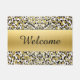 Gold Leopard Print Customisable Welcome Mat. Elegant glittery metallic gold leopard animal print doormat with a gold textured bar and the greeting Welcome. The text can be edited to say anything you like, or leave as is. Your choice. #pink #lace #welcomemat