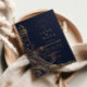 An elegant night-time coastal wedding design featuring a luminous gold lighthouse illustration set against a deep navy backdrop. Flowing ocean waves, celestial accents, and refined metallic linework create a dramatic, high-end atmosphere inspired by seaside evenings and maritime romance.