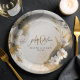 This unique paper plate is part of a sophisticated fortieth anniversary collection. The design features soft watercolor tones of beige and charcoal, highlighted with shimmering gold accents and delicate floral line art. Bold typography balances beautifully with graceful script details, creating a sophisticated and romantic look. Perfect for celebrating '40 years of love' in timeless style. Search ID1169 to see other products in this design set.