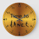This sleek custom wall clock is perfect for dance lovers or a dance studio. It has silhouettes of dancers in different poses that spell the word "dance." The clock has black numbers and dots for the minutes. The background is an image of a gold-looking metallic background. There is no metal on the clock. it is just a picture.