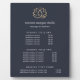 Elegant plaque with easel displays your spa, massage or wellness related services or price list in classic white lettering on a rich navy blue background adorned with a faux gold foil lotus flower. Includes three customizable headings and body text fields. To adjust layout, enter your text and then use the Customize function to change positioning and font sizes.