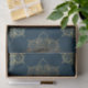 A pattern of beautiful gold mandalas repeated into an ornate damask pattern. The gold is shiny to imitate real gold foil. The mandalas are designed with intricate, hand drawn line work and placed on a deep navy blue background.