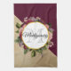 Kitchen towel with a golden marble pattern and a solid burgundy colour layered diagonally together. A circle with a faux gold foil border which is layered over a pretty floral bouquet with roses, carnations and other flowers. Personalise with your name and monogram inside the circle.