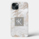 Elegant iPhone case done in a white, grey and gold marbled pattern. A grey and gold square text area, in the middle of the case, has a single white script monogram. Personalise the one letter monogram, for yourself or as a great gift idea for her.