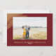 Gold Merry Christmas Script Photo Holiday Card. This beautiful flat card features a modern and elegant script, with a golden watercolor splash and a solid burgundy wine colour background. Change the template photo for your own. Please contact Antique Chandelier if you would like any changes to this holiday card design.