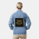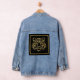 This wild animal themed denim jacket features a metallic-look tiger face in gold on a black background. It is framed by a square gold frame. Denim jackets go with everything, dress them down or up.
