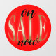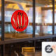 Modern round window cling design featuring the text "On SALE now" on a red background.