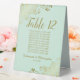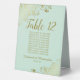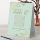 These elegant gold and neo mint green tent signs will make it easy for your guests to find their seats, and also make your wedding reception more beautiful. The feature a simple design with a lacy script calligraphy title with the table number and space for the names of 10 guests. Below is space for the names of the couple and the wedding date. The corners are decorated with lacy floral curls and swirls. Great way to add a touch of formal class to your reception.