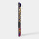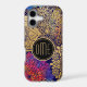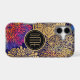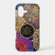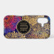 This unique and interesting phone case has a background made of an eastern style mandala pattern. The mandala pattern is mostly in bright gold, with touches of purple, violet, orange red and blue. At the centre is a black circle banner lined in gold that contains your three letter monogram, also in gold. Everything is placed on a dramatic black background.