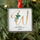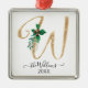 Gold Monogram W Glitter Christmas Holly Foliage Metal Ornament