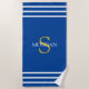 Gold Monogram & White Name, White Stripes, Dp Blue Beach Towel