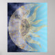 A whimsical, mystic universe nebula gold crescent moon and wavy rays sun mandala celestial design, featuring a crescent stage glowing moon with mandala flowers and night dark blue nebula galaxy stars, dots, circles geometric shapes, mermaid scale, and wavy rays sun mandala, floral and leaves doodling art, made with a faux yellow gold texture, and daylight sky blue background. This beautiful, mystical, cute moon, and sun henna mandala style universe theme, original artwork is perfect for home decor, everyday wear, special occasion, or theme decorations.