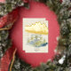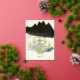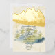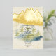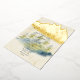 A gorgeous wedding invitation with a gold foil backdrop and green and blue spruce trees in the foreground