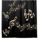 This decorative shower curtain features a musical theme. Gold sheet music notes are whimsically placed across a black background. It's a perfect gift for the musician in your life.