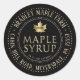 Gold sugar maple leaf and gold dotted border on black. "Maple Syrup" is printed in a chiseled metallic font.