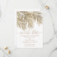 Modern gold palm tree elegant save the date. Modern simple faux gold palm tree with simple typography, a trendy and tropical save the date wedding theme on palm tree leaf with editable white.