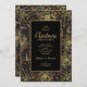 Gold poinsettias, holly leaves and berries on a black background, your party information is featured in chic lettering on these Christmas holiday party invitations.