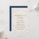 This gold polka dots engagement party invitation card is perfect for an elegant event. The simple design features chic gold confetti on a creamy champagne background with beautiful faux gold foil calligraphy and a navy blue backing.