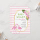 Gold foil polygon, flamingos and tropical flowers baby girl shower invitation. It features pink flamingos, tropical flowers and leaves. The text is in a white frame with gold foil polygon frame. Behind it there is a striped pattern with pink and white stripes.