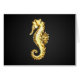 Artistic, polygonal, seahorse of sparkling, gold foil on black background.
