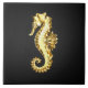 Artistic, polygonal, seahorse of sparkling, gold foil on black background.