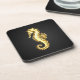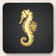 Artistic, polygonal, seahorse of sparkling, gold foil on black background.